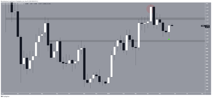 Bất chấp nến tăng giá, hướng của xu hướng vẫn chưa được xác định cho đến khi TOTALCAP vượt qua mức 1.17 nghìn tỷ USD hoặc thay vào đó là phá vỡ xuống mức 1.03 nghìn tỷ USD.