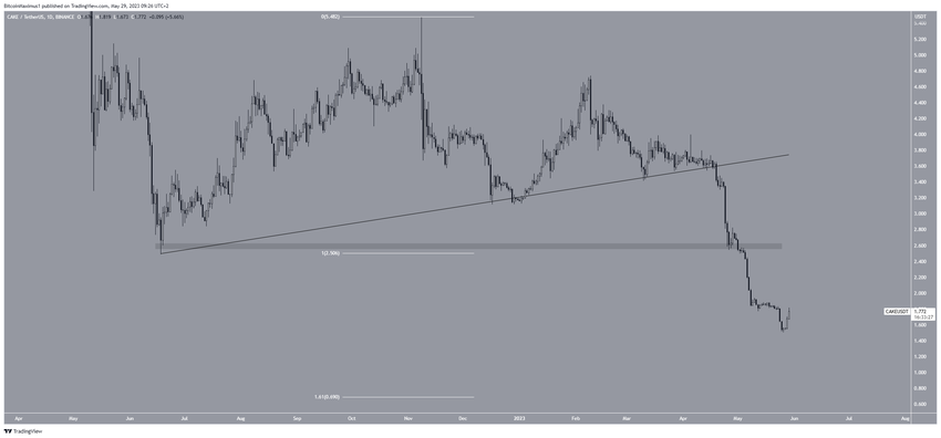 Giá CAKE đã giảm mạnh kể từ khi altcoin này phá vỡ tại đường hỗ trợ tăng dần vào ngày 20/4. Chuyển động đi xuống đã dẫn đến mức đáy mới hàng năm là 1.5 USD vào ngày 26/5.