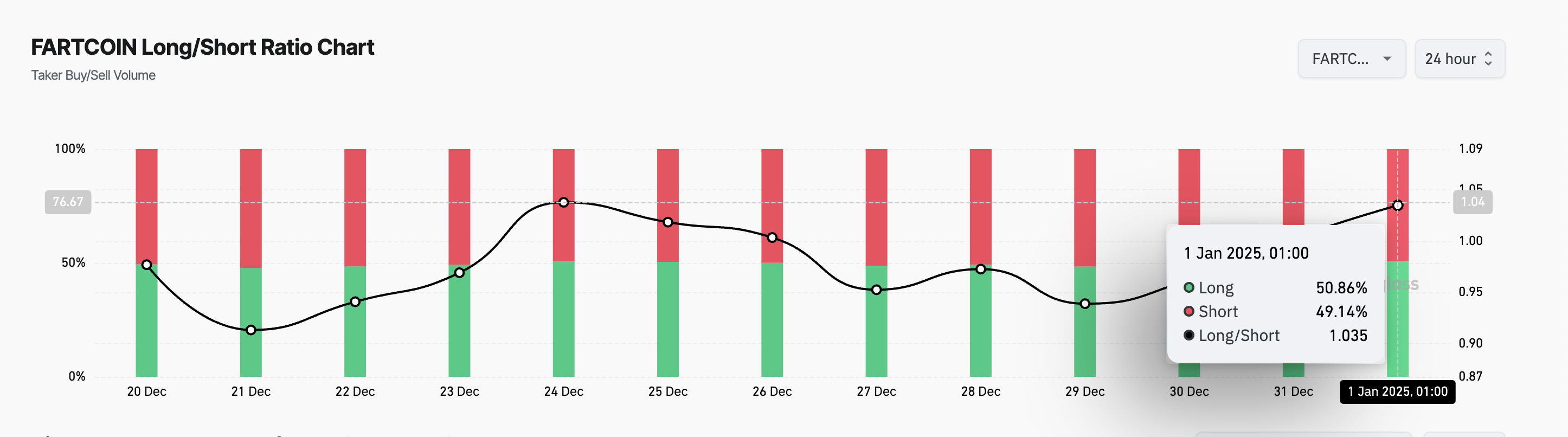 Tỷ lệ Long/Short của FARTCOIN đang ở mức 1.04, xác nhận nhu cầu cho các vị thế long từ những người tham gia thị trường phái sinh của nó. Tỷ lệ long/short của một tài sản đo lường số lượng vị thế long (đặt cược vào việc giá tăng) so với vị thế short (đặt cược vào việc giá giảm) trong một thị trường. Khi tỷ lệ này trên 1, điều đó cho thấy nhiều nhà giao dịch đang giữ vị thế long, gợi ý tâm lý lạc quan khi hầu hết mong đợi giá sẽ tăng.