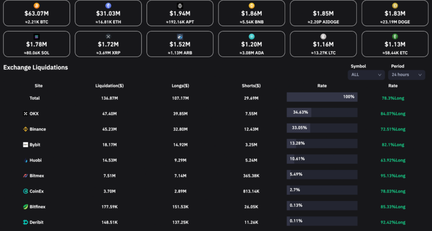 Nhưng ngược lại, xu hướng giảm giá trên thị trường khối lượng bị thanh lý trong các giao dịch lên tới 136.85 triệu USD trong 24 giờ qua. Theo Coinglass, 32,738 trader đã bị thanh lý. Trong đó, sàn giao dịch OKX đã thanh lý một giao dịch trị giá 5.62 triệu USD.