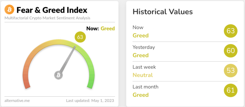 Tại thời điểm viết bài, chỉ số Chỉ số Tham lam và Sợ hãi (Fear & Greed Index) đang ở mức 63, cho thấy tâm lý tham lam trên thị trường. Trang web Alternative.me đo lường chỉ số này bằng cách phân tích cảm xúc và tình cảm trên thị trường thông qua nhiều nguồn.