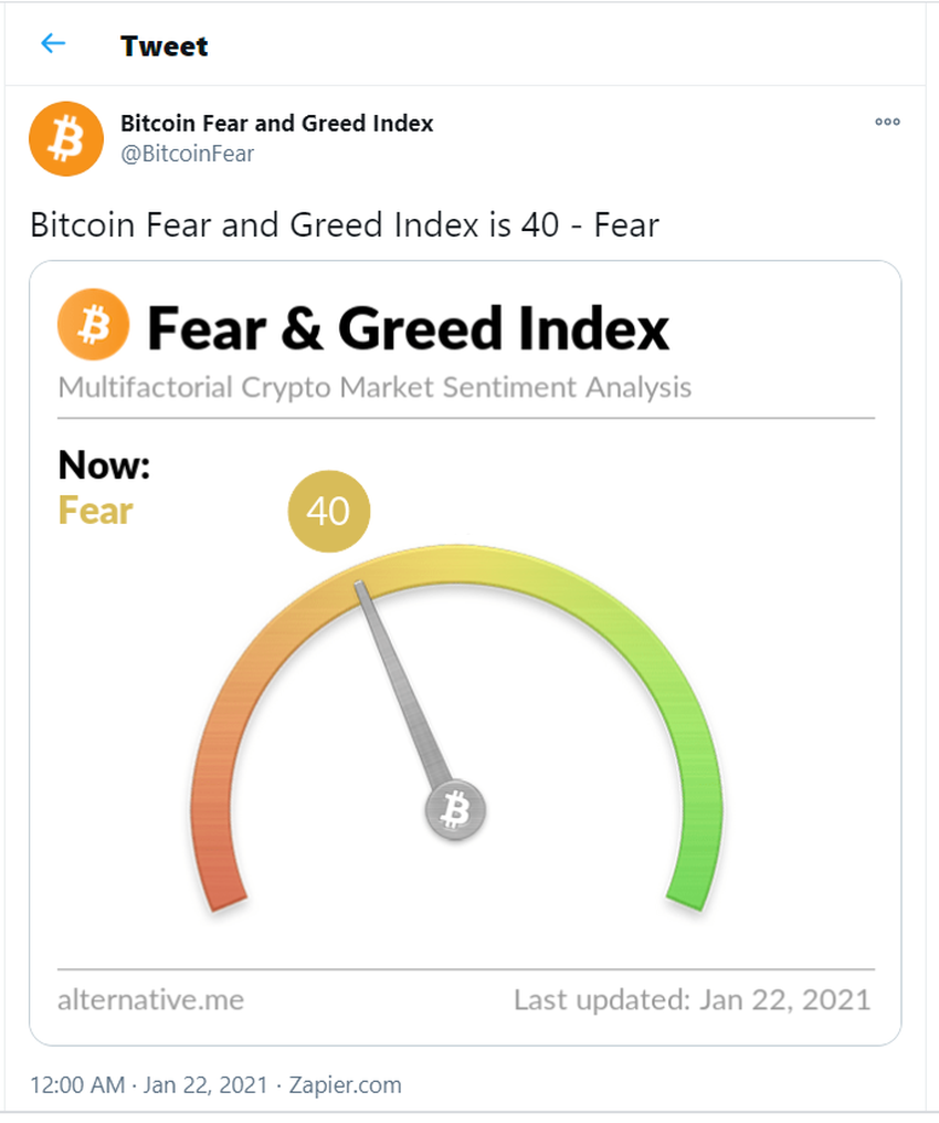 Theo chỉ báo tham lam và sợ hãi (FGI) ngày 22/01 đạt mức 40 thể hiện thị trường đang “sợ hãi”. Dường như, những ảnh hưởng từ hành động của thị trường gấu nhiều hơn chúng ta nghĩ.