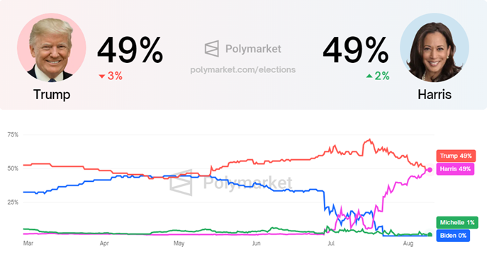 Trước những phát triển mới nhất, Harris đã ngang bằng với Trump trên Polymarket. Sau nhiều tuần Trump dẫn đầu, đây là lần đầu tiên hai người ngang điểm. Điều này cho thấy các chiến lược của đảng Dân chủ đang phát huy tác dụng nếu như xét trên tỷ lệ cược trên Polymarket là đủ để làm căn cứ.