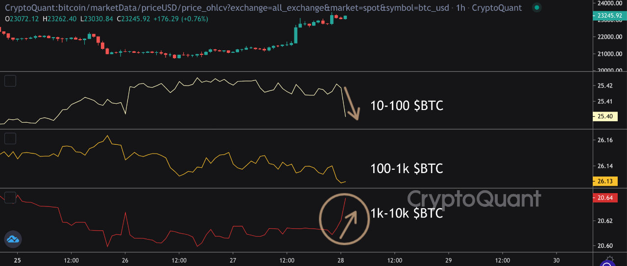 Quan sát chi tiết hơn ở khung thời gian 1h, thì thời điểm tin tức được công bố đã có sự gia tăng về số lượng các ví cá voi Bitcoin. Đó là những ví có số dư lớn từ 1,000 – 10,000 BTC.