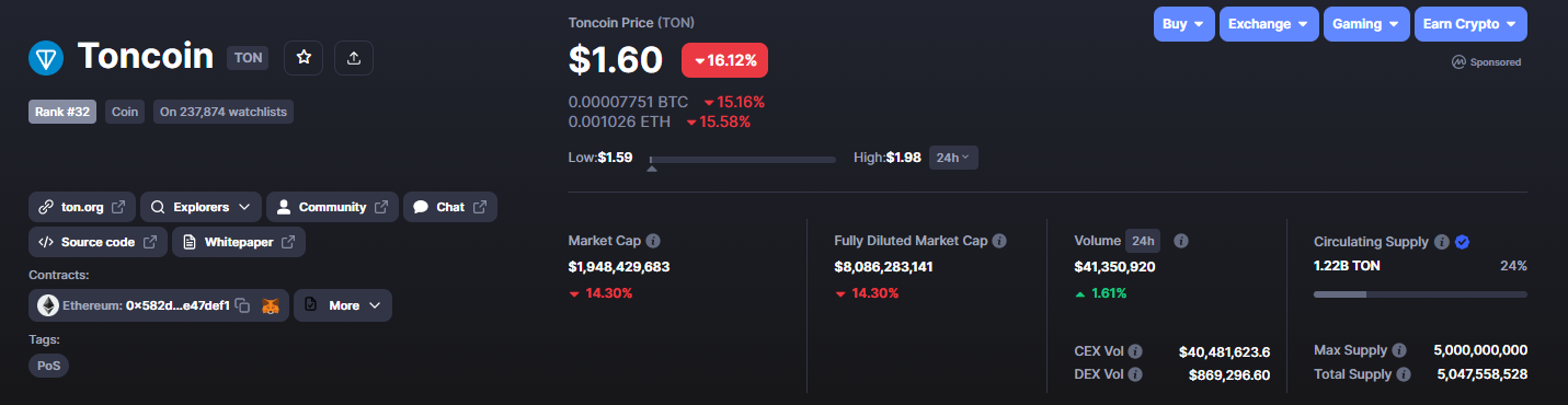 Tại thời điểm BeInCrypto thực hiện bài viết này, giá Toncoin hiện đang được giao dịch ở mức 1.6 USD. Mức giá này đã giảm 72.29% so với mức ATH ngày 12/11/2021. Tuy nhiên, so với thời điểm ngày 20/9/2021, mức giá TON hiện tại đã tăng hơn 314%.