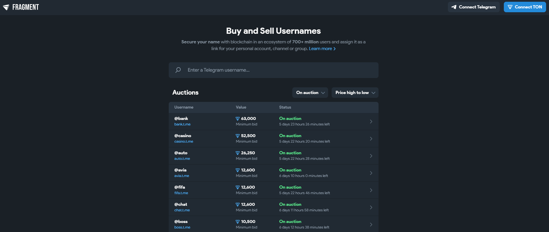 Tiếp nối sự thành công của dự án tên miền .ton, ngày 27/10/2022 vừa qua, Pavel Durov (Founder của Telegram) đã thông báo về việc nền tảng nhắn tin này đã cho phép người dùng có thể mua Telegram username trên một nền tảng gọi là Fragment. Tương tự như việc sở hữu tên miền .ton, người dùng có thể mua Telegram username thông qua hình thức đấu giá (auction) bằng Toncoin.