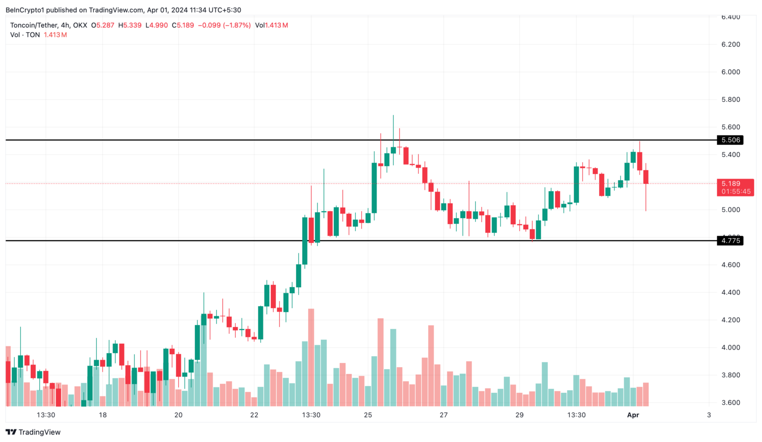 Toncoin được xếp hạng là loại tiền điện tử lớn thứ 11 tính theo vốn hóa thị trường, chứng tỏ sự biến động về giá. Sau khi đạt mức cao nhất mọi thời đại vào tháng 3, TON đang củng cố trong khoảng từ 4.77 USD – 5.50 USD. Một đột phá trên 5.50 USD với khối lượng mạnh có thể cho thấy xu hướng tăng tiếp tục.