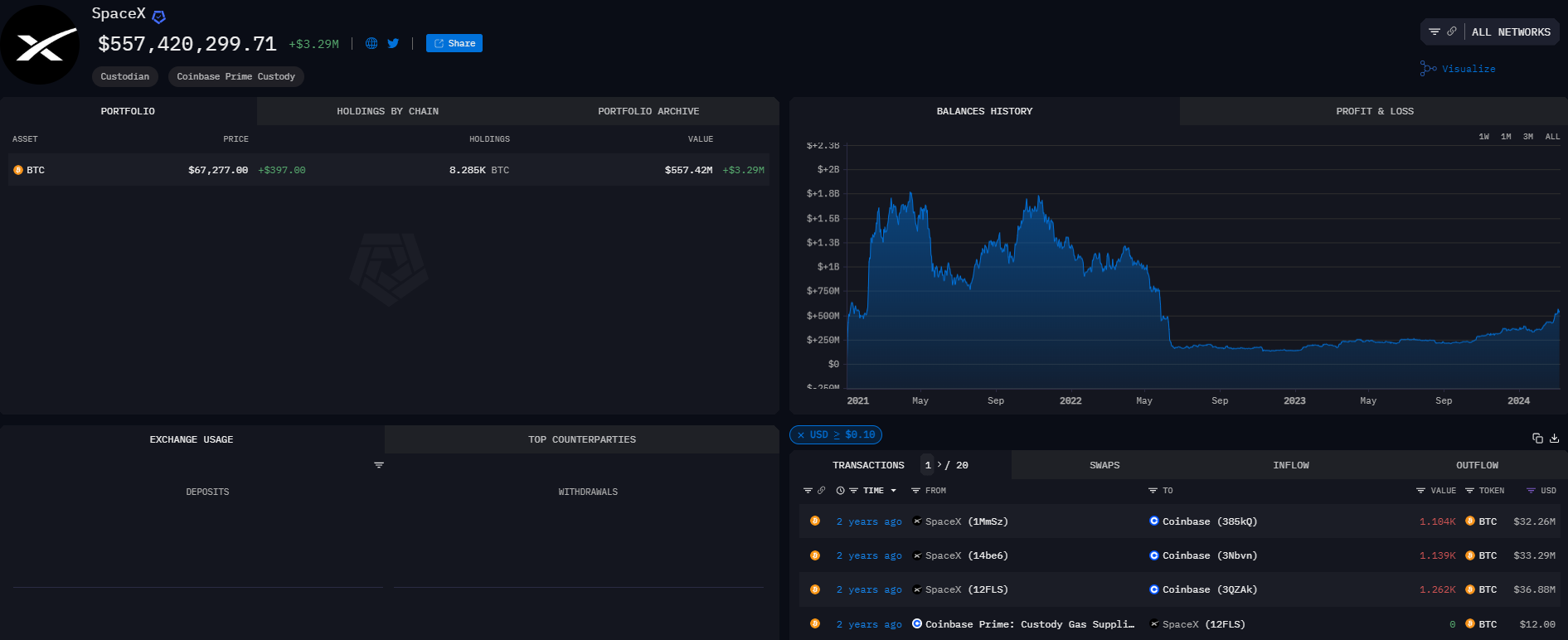 Trong khi đó, tỷ lệ nắm giữ của SpaceX là 8,290 BTC trị giá 560 triệu USD trên tổng cộng 28 địa chỉ.