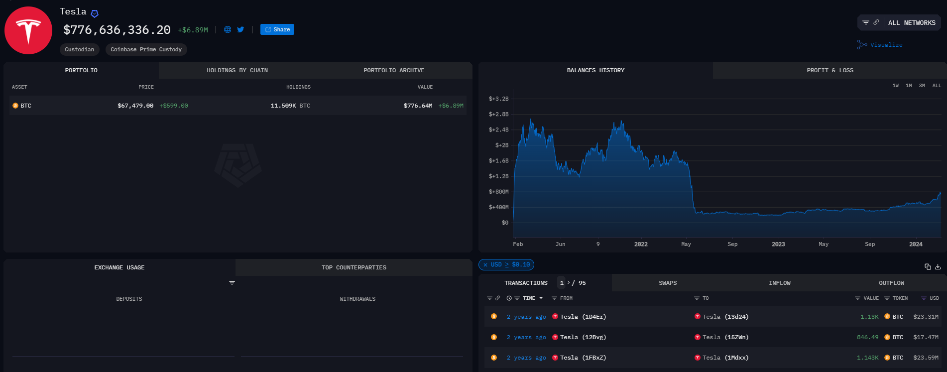 Một đoạn tweet được chia sẻ bởi Arkham Intel cho thấy họ đã xác định được các ví thuộc về Tesla và SpaceX có chứa Bitcoin. So với số lượng báo cáo thì có thể Tesla đã mua thêm Bitcoin (BTC) trong năm 2024.