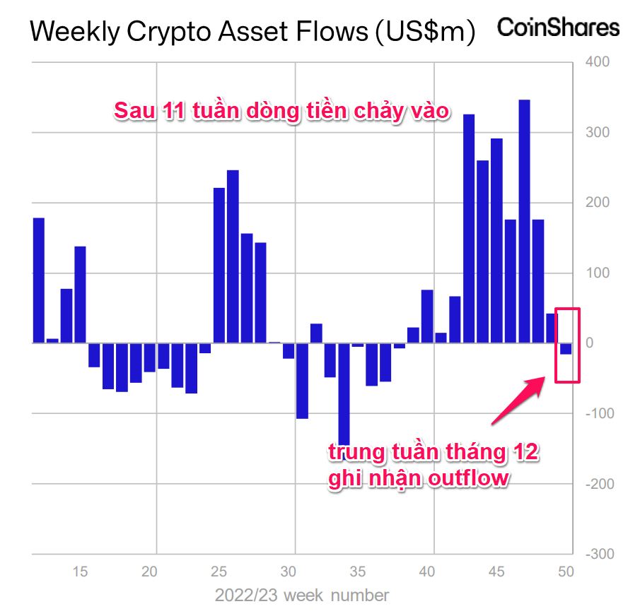 Báo cáo Weekly Crypto Asset Flow mới đây nhất của Coinshares cho thấy dấu dòng tiền outflow vượt trội hơn inflow lần đầu tiên sau 11 tuần các quỹ duy trì dòng tiền chảy vào liên tiếp. Điều này có thể là dấu hiệu cho thấy động thái chốt lời từ các quỹ.