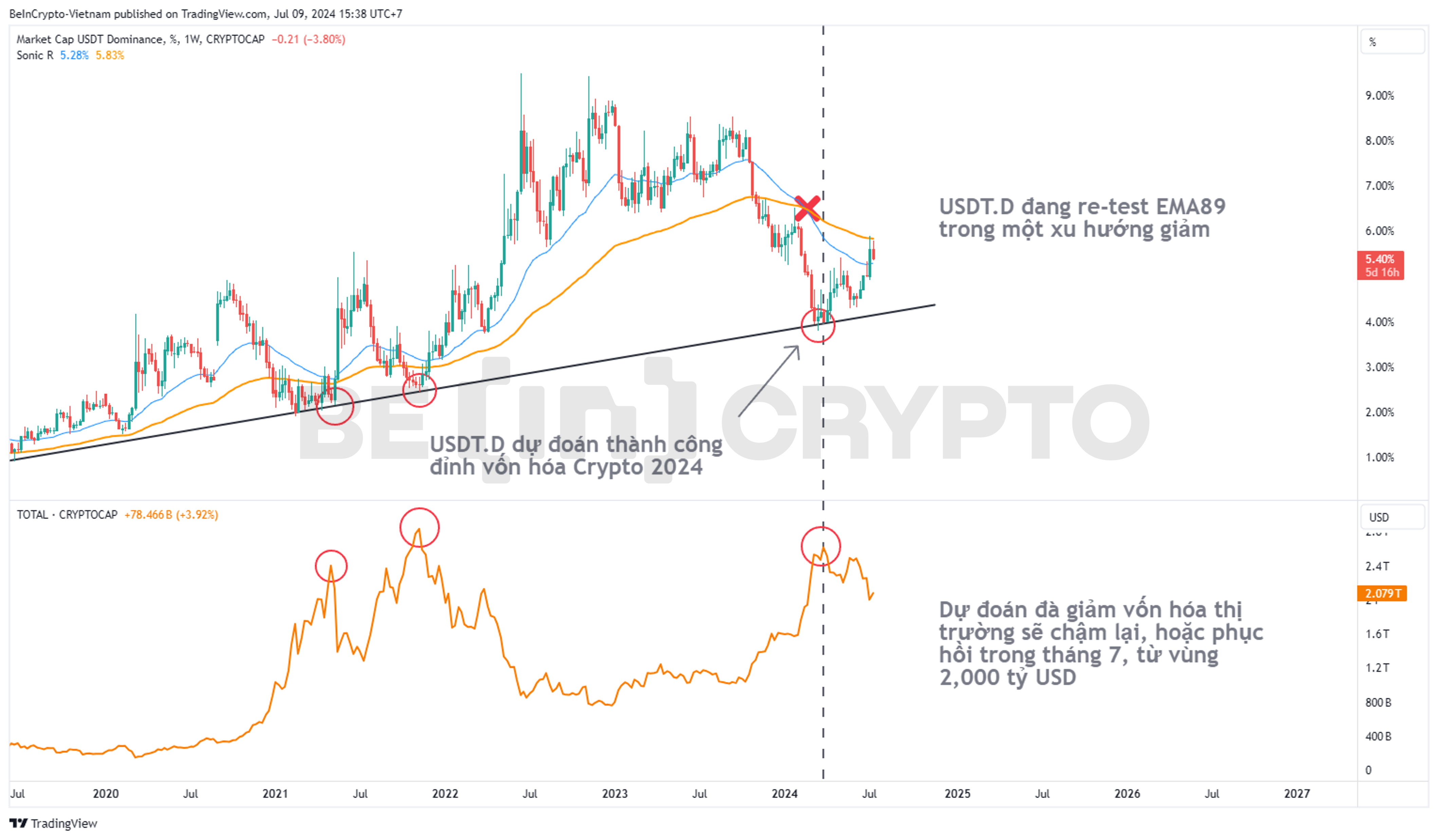 - Nếu USDT.D suy giảm từ đây, thì đồng nghĩa vốn hóa thị trường sẽ còn tiếp tục phục hồi trong tháng 7. Luận điểm này chỉ cân nhắc lại khi nào USDT.D đóng nến tuần vượt EMA89 ở 6%.