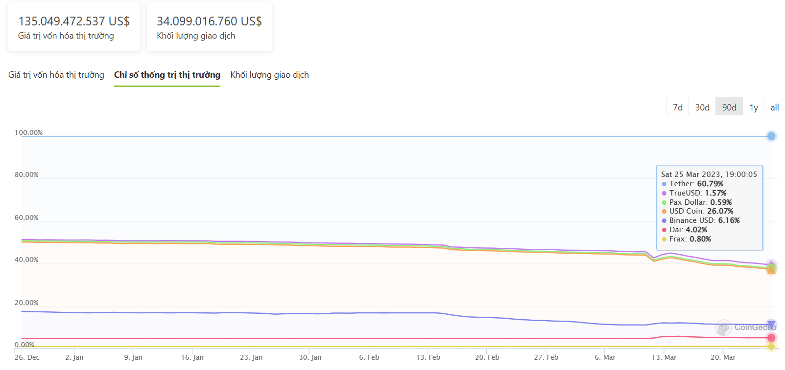 USDT đang chiếm hơn 60% thị phần stablecoin. Chưa hết, khối lượng của USDT chiếm ưu thế một cách áp đảo trong Q1. Thời điểm ngày 22/3, khối lượng USDT gấp hàng chục khối lượng của tất cả các stablecoin khác cộng lại.