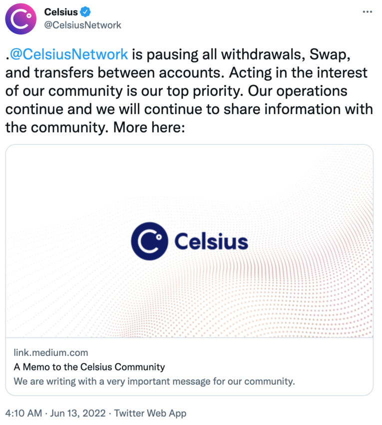 Theo đó, hôm nay, ngày 13 tháng 6, Celsius đã thông báo trên kênh Twitter chính thức và qua email, vào khoảng 04:00 CEST, cho tất cả các khách hàng của mình rằng nền tảng này sẽ tạm dừng việc rút tiền, swap – hoán đổi và chuyển tiền nội bộ giữa các tài khoản.