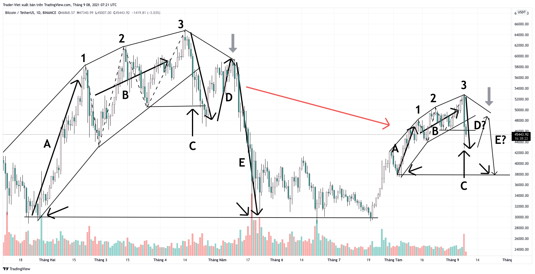 - Theo đó, biến động của Bitcoin từ tháng 8 đến nay được Dương Huy chỉ ra cũng gần giống như mô típ nêu trên. Nghĩa là, giá Bitcoin trong tháng 9 sẽ phục hồi lên 48k (sóng D). Nhưng sau đó, sẽ tiếp tục giảm mạnh đến vùng 38k đô. Nghĩa là một đợt sụt giảm 10k đô la tương tự nữa sẽ xảy ra.