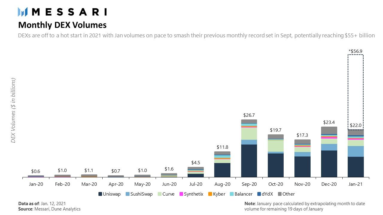Được dẫn đầu bởi Uniswap, các sàn giao dịch phi tập trung cho phép bất kỳ giao dịch ẩn danh nào. Ở đó, gần như tất cả mọi người có thể cung cấp thanh khoản cho hầu hết các token. Theo Messari Research, DEX đang trên đà tiến tới mốc 56,9 tỷ USD về khối lượng giao dịch trong tháng 1/2021. Kỷ lục trước đó là 26,7 tỷ USD trong tháng 9/2020.