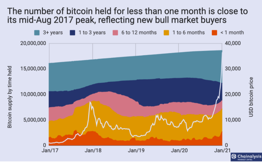 Nghiên cứu từ Chainalysis thông qua blogger fklivestolearn cho thấy một số dữ liệu thú vị, khi nói đến những người nắm giữ đã duy trì trong bao lâu. Các địa chỉ ví của những người nắm giữ dài hạn đang tăng lên về giá trị. Điều tương tự cũng diễn ra với những ví có thời gian nắm giữ dưới 1 tháng.