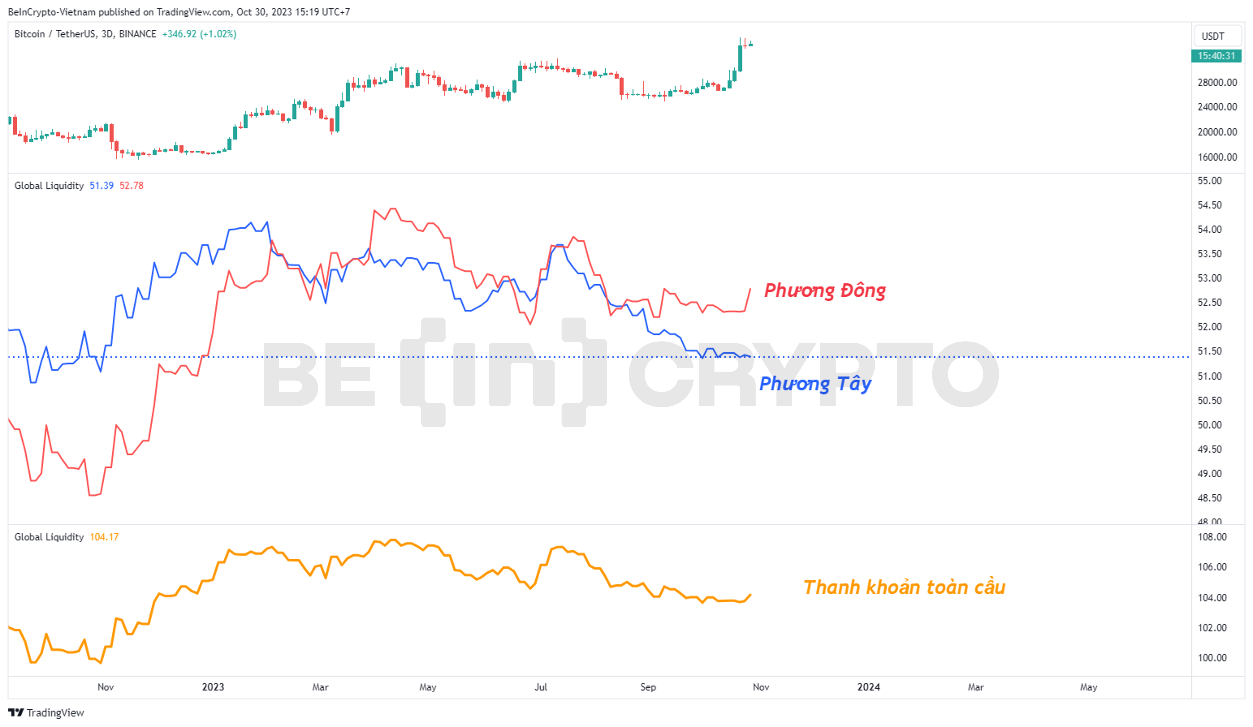 - Trong con số tương đối này, thì các nền kinh tế phương Đông đang tỏ ra dồi dào thanh khoản hơn (một chút) so với các nền kinh tế phương Tây. Và sự phục hồi thanh khoản toàn cầu trong tháng 10 này cũng chỉ là một biến động rất nhỏ trong sự suy giảm thanh khoản của năm 2023.