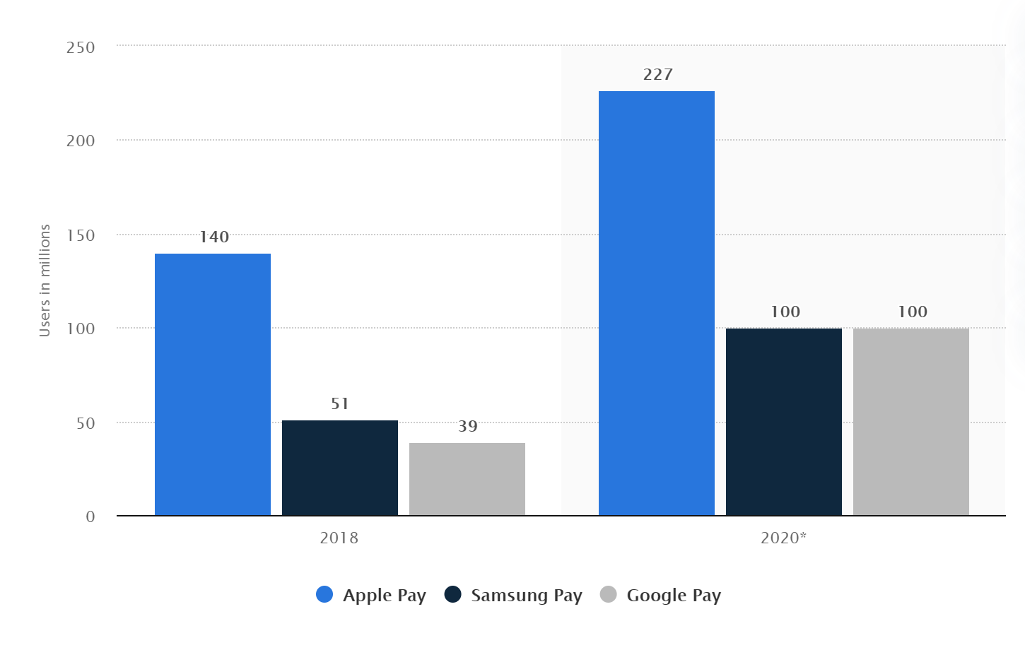 Theo dự tính của statista.com, lượng người dùng của Samsung Pay và Google Pay có thể lần lượt đạt 100 triệu người trong năm 2020. Trong khi đó, Apple Pay (đã chấp nhận Bitcon) có thể đạt 227 triệu người.