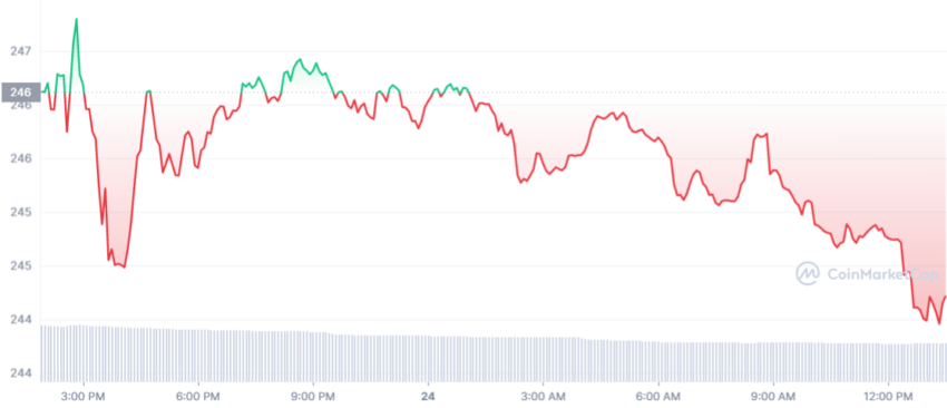 Giá BNB đã mất 0.8% giá trị trong 24 giờ qua để giao dịch ở mức 244.36 USD vào thời điểm BeInCrypto viết bài này. Trong 7 ngày qua, giá trị của đồng tiền được hỗ trợ bởi Binance đã tăng hơn 7%. Tuy nhiên, giá của nó đã giảm hơn 17% trong 30 ngày qua do hàng loạt các Binance FUD khiến người dùng lo lắng ngày càng tăng về khả năng thanh toán của sàn giao dịch. Sàn giao dịch do CZ dẫn đầu đã ghi nhận dòng tiền chảy ra lớn khoảng 6 tỷ USD khi người dùng bắt đầu rút tiền hàng loạt.