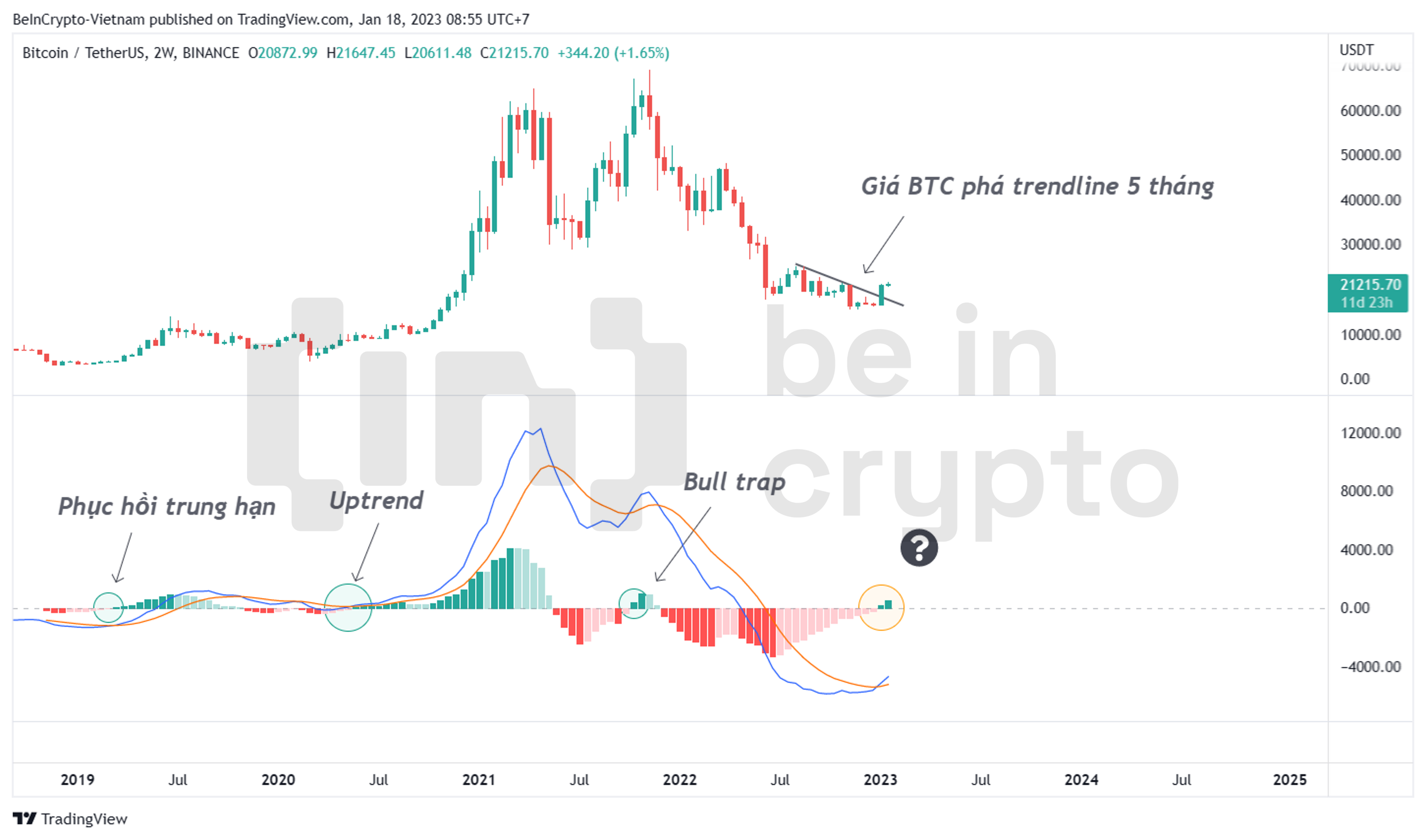 Thời điểm BeInCrypto viết bài này, giá BTC đã bước sau nửa sau của tháng đầu năm 2023. Bằng cách quan sát biểu đồ 2 tuần (2W), chúng ta nhận ra tín hiệu hiếm có như sau.