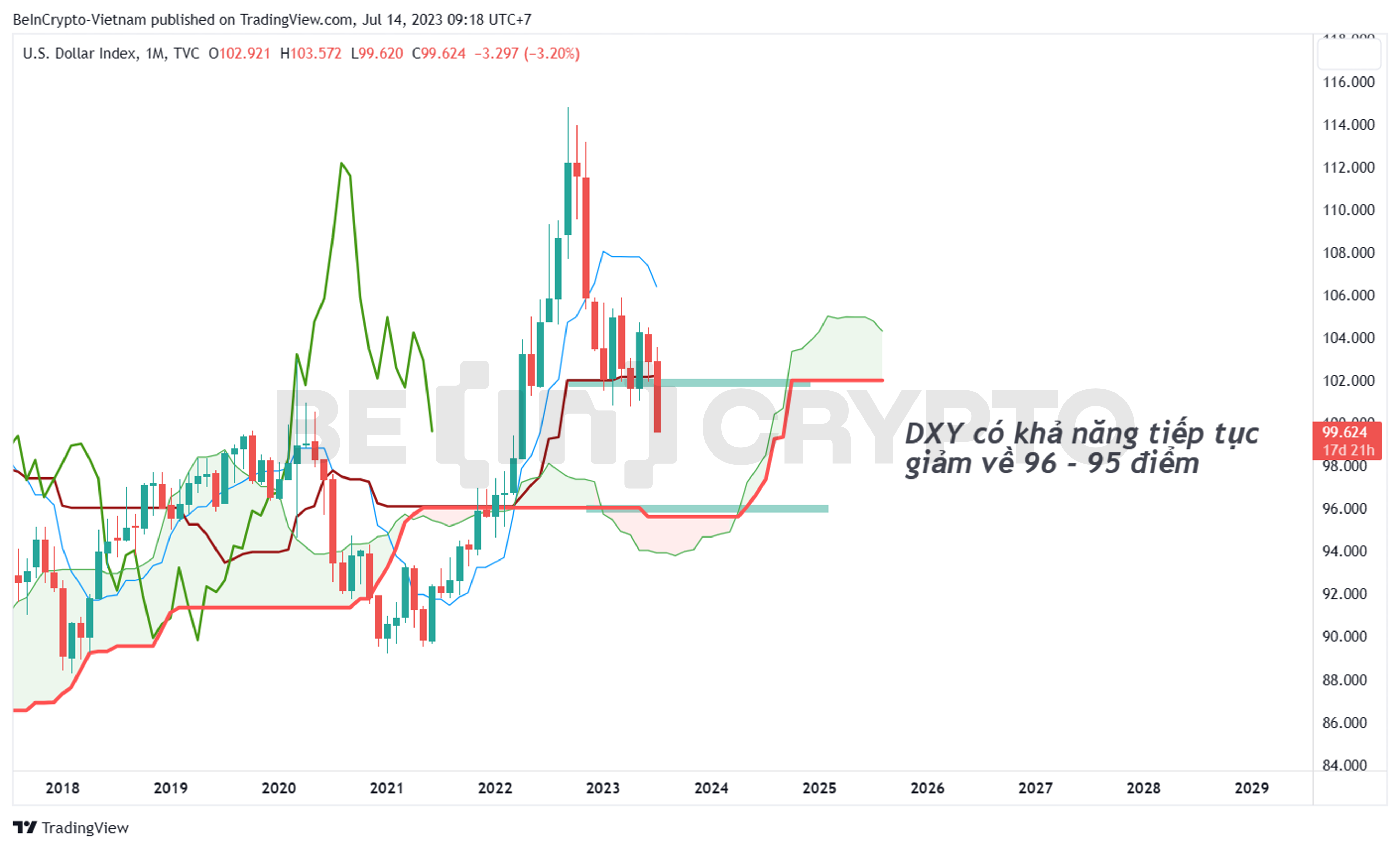 - Xét ở góc độ phân tích kỹ thuật, DXY vẫn có khả năng giảm tiếp trong tháng này. Có hai vùng phẳng lớn của chỉ báo Ichimoku trong khung tháng được tạo bởi Senko SpanB. Đó là vùng 101 điểm và vùng hỗ trợ tiếp theo là 96 điểm. (đánh dấu xanh trên biểu đồ).