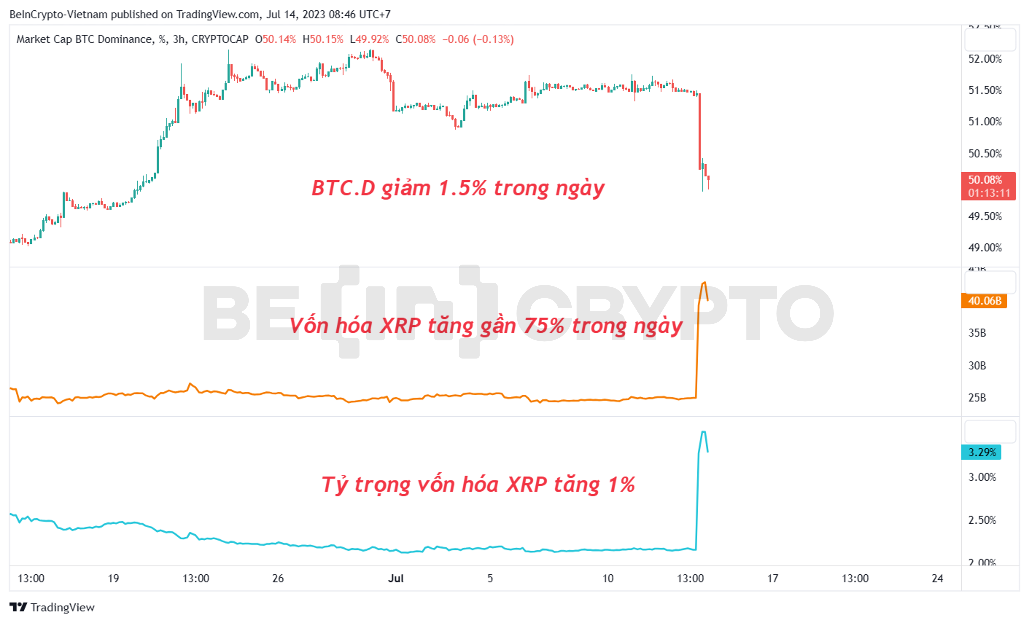 Ripple được tòa phán quyết rằng không vi phạm luật chứng khoán (một phần) vào đêm hôm qua đã khiến cả thị trường dậy sóng. Dù hầu hết các đồng tiền đều có biến động, nhưng dòng tiền vào XRP đã thay đổi cấu trúc thị phần, khiến cho Bitcoin Dominance (BTC.D) giảm mạnh 1.5% chỉ trong một nến ngày.