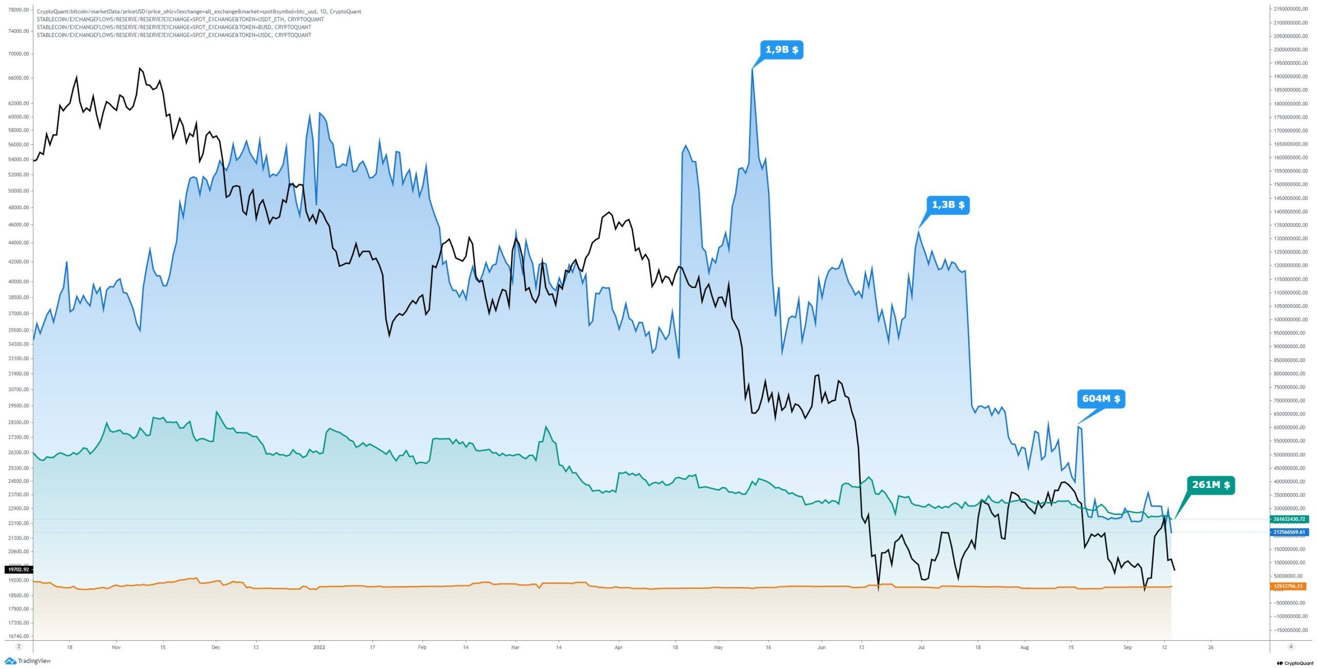 Biểu đồ trên cho thấy, lượng stablecoin trên các sàn spot đã giảm liên tục trong gần 4 tháng qua, chứng tỏ dòng vốn mới chưa đổ vào thị trường. Quan sát bên trong lượng stablecoin này, lượng trên sàn của USDT, USDC, BUSD vẫn không hề có chút đột biến tích cực nào.