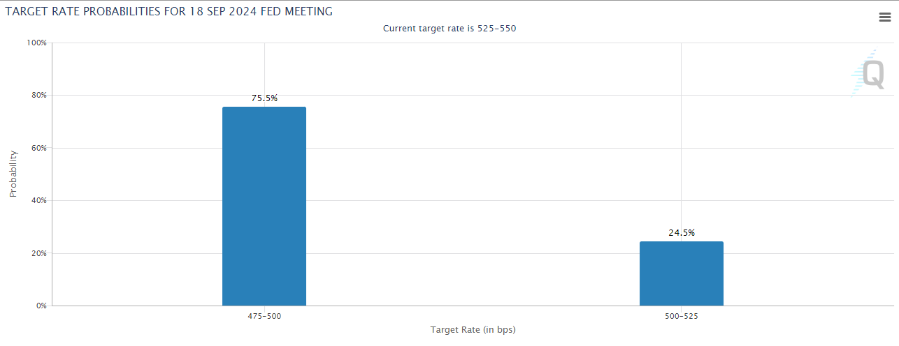 Dữ liệu mới nhất từ CME chỉ ra rằng có 75.5% khả năng Cục Dự trữ Liên bang Mỹ sẽ cắt giảm lãi suất 50 bps vào ngày 18/09. Nhà phân tích tài chính Robert Prechter kỳ vọng Fed sẽ thực hiện cắt giảm lãi suất khẩn cấp trước cuộc họp vào tháng 9.
