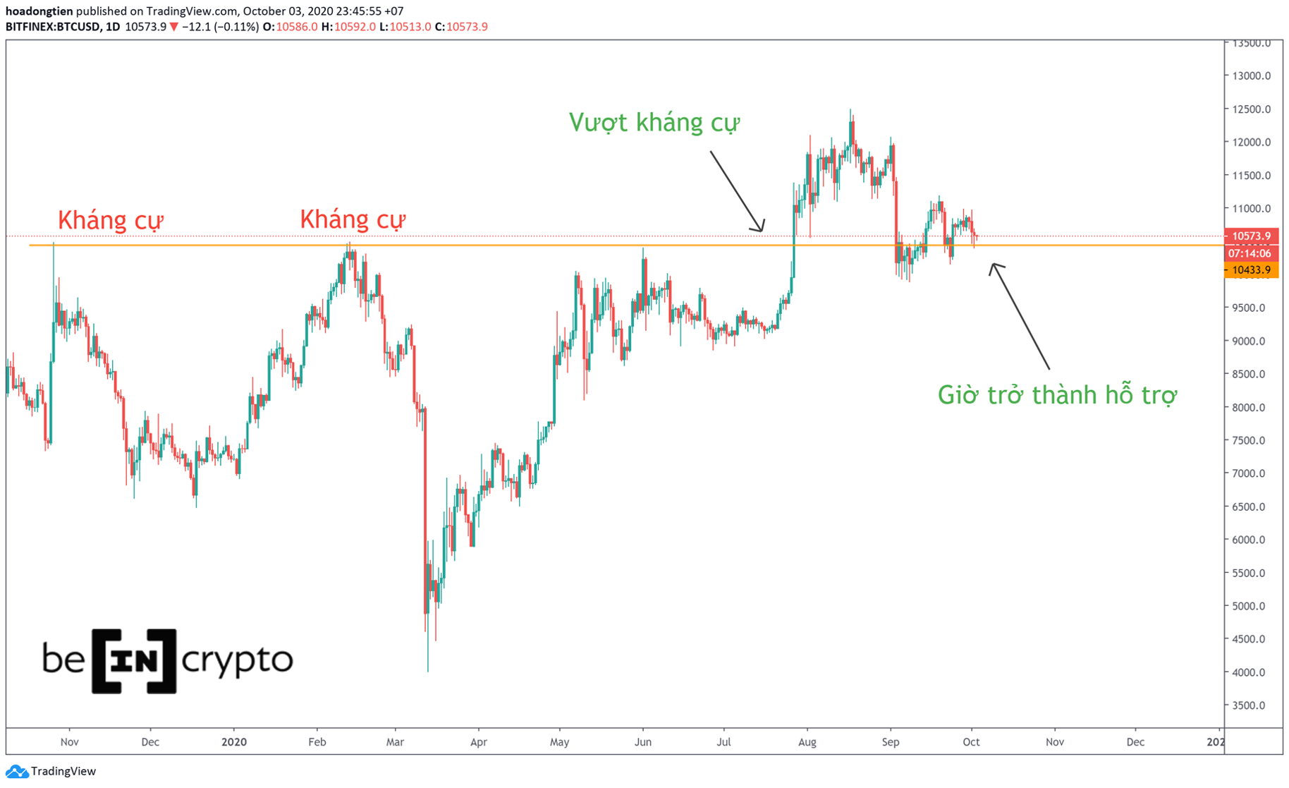 Trong góc nhìn này, thì 10.400 ~ 10.500 đô la là mức kháng cự trước đây giờ đã trở thành hỗ trợ. Việc giá sụt giảm từ hơn 12.000 đô trở về lại mức này có thể xem như động thái re-test theo phân tích kỹ thuật. Tuy nhiên, nếu chọn đứng về phe bò, trader nên cắt lỗ khi phá vỡ mốc 10.000 để tránh thiệt hại nhiều hơn.