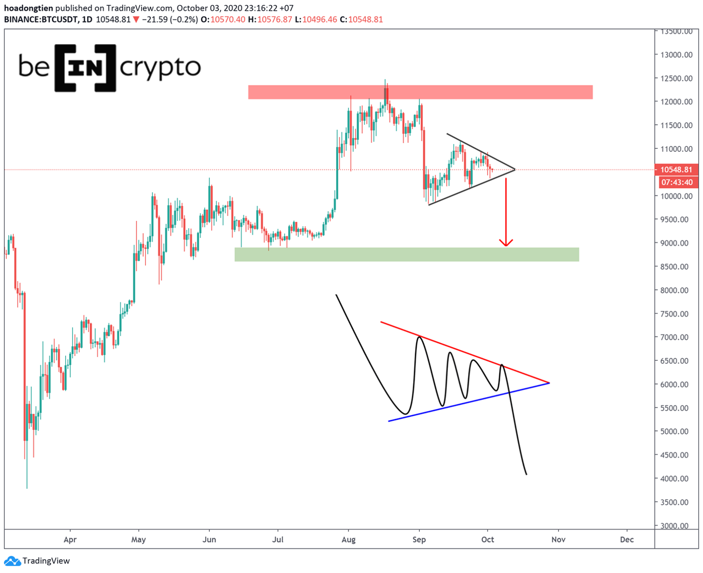Biến động giá Bitcoin của khung D1 đi trong một mô hình giá tam giác cân. Mô hình giá tam giác cân thể hiện “trạng thái dừng” của một cơn tâm lý đã diễn ra trước đó. Có thể thấy, trước đó Bitcoin đã sụt giảm 20% từ mức 12.400 đô la.