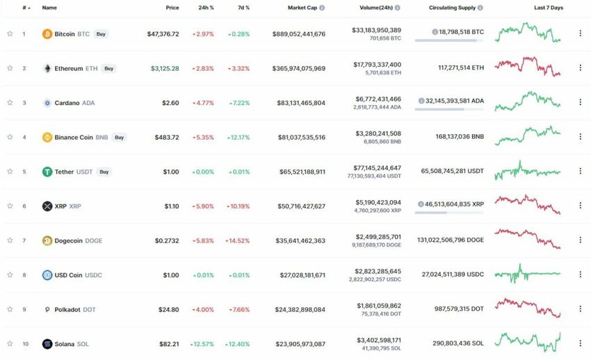 Bitcoin ( BTC ) đã bắt đầu ngày thứ sau của tuần làm việc với một sự sụt giảm đã chuyển thành một sự điều chỉnh. Vào lúc 05:27 (giờ Moscow), đồng tiền này đang được giao dịch ở mức 47,334 đô la. Theo CoinMarketCap, mức tạo đỉnh nến ngày của tiền điện tử được cố định ở mức 48,710 đô la. Ngược lại, mức tạo đáy nền ngày là 46,394 đô la.