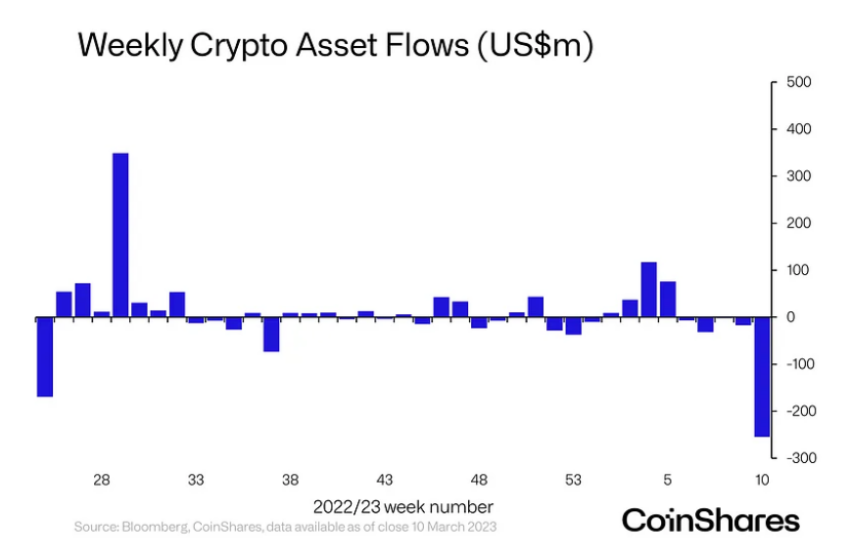 Sự hỗn loạn gây ra bởi sự sụp đổ của các ngân hàng công nghệ đã khiến các nhà giao dịch tiền điện tử hoảng sợ vào tuần trước. Theo báo cáo mới nhất của CoinShares được công bố vào thứ 2, các nhà đầu tư đã rút số tiền kỷ lục 255 triệu USD từ các quỹ giao dịch tiền điện tử. Điều này đánh dấu dòng tiền ra hàng tuần lớn nhất mà công ty từng ghi nhận.