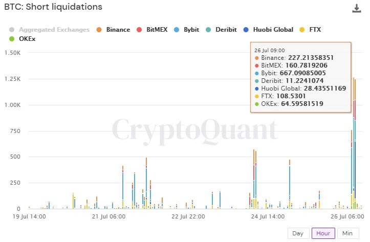 Nền tảng phân tích trên chuỗi CryptoQuant đã ghi nhận việc thanh lý hàng loạt các vị thế bán khống trên thị trường tiền điện tử. Theo báo cáo có khoảng 3.280 BTC ở vị thế short đã được thanh lý chỉ trong ba giờ. Số tiền này tương đương với khoảng 111 triệu đô la theo giá tại thời điểm trước khi tăng đột biến.