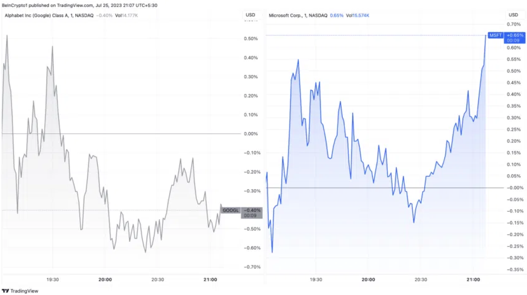 Thật vậy, cổ phiếu của họ đã thể hiện dự đoán này, với Alphabet ghi nhận mức giảm 0.40% và Microsoft tăng 0.65%.