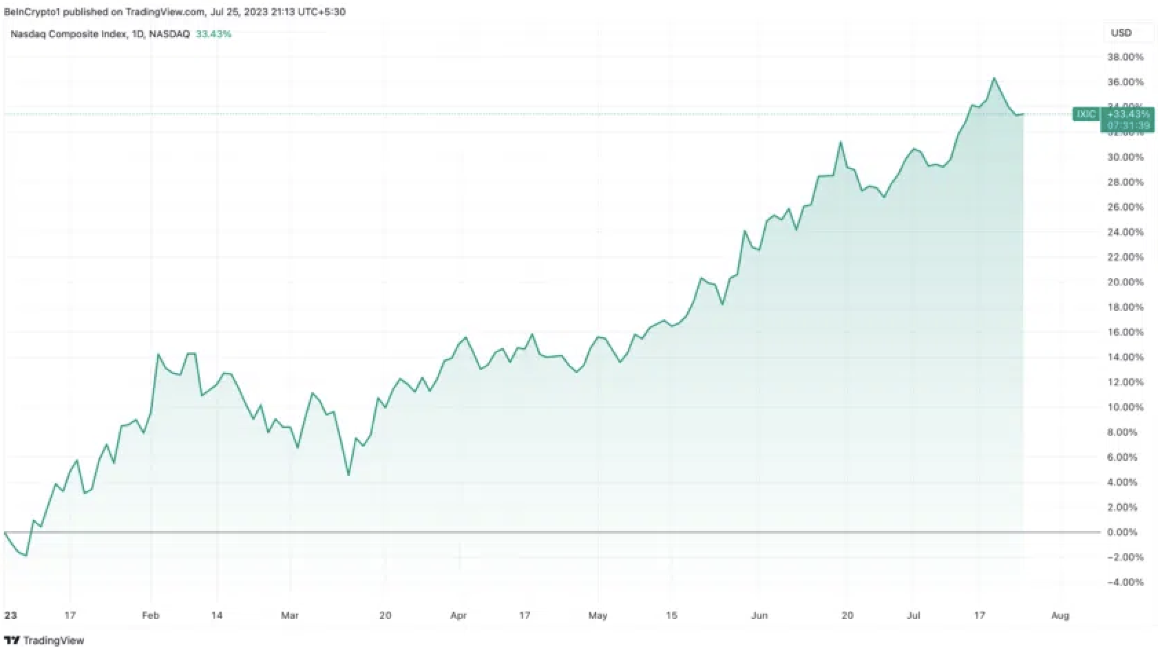 Chỉ số tổng hợp Nasdaq cũng đã ghi nhận mức tăng ấn tượng với khoảng 33.40% trong năm nay. Một phần đáng kể của đợt phục hồi này có thể là do các công ty tăng trưởng vốn hóa lớn nhạy cảm với lãi suất.