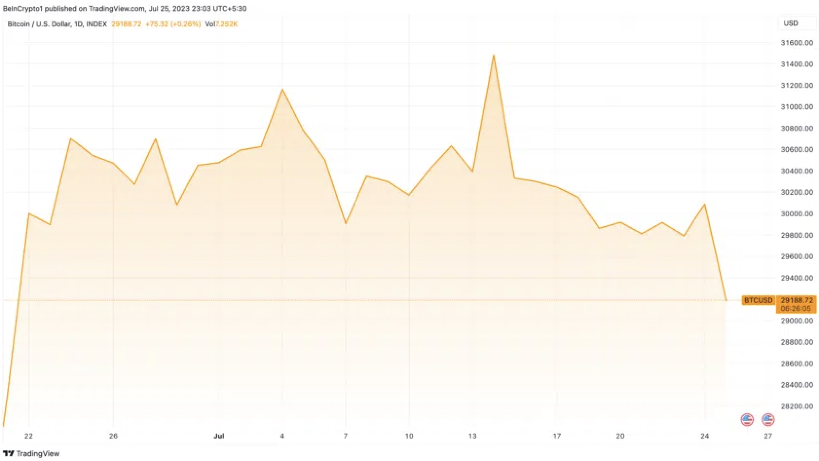 Bất chấp các chỉ thị kinh tế vĩ mô biến động, Bitcoin phần lớn vẫn duy trì phạm vi giao dịch với biên độ dao động trong khoảng từ 29,000 USD đến 31,500 USD.