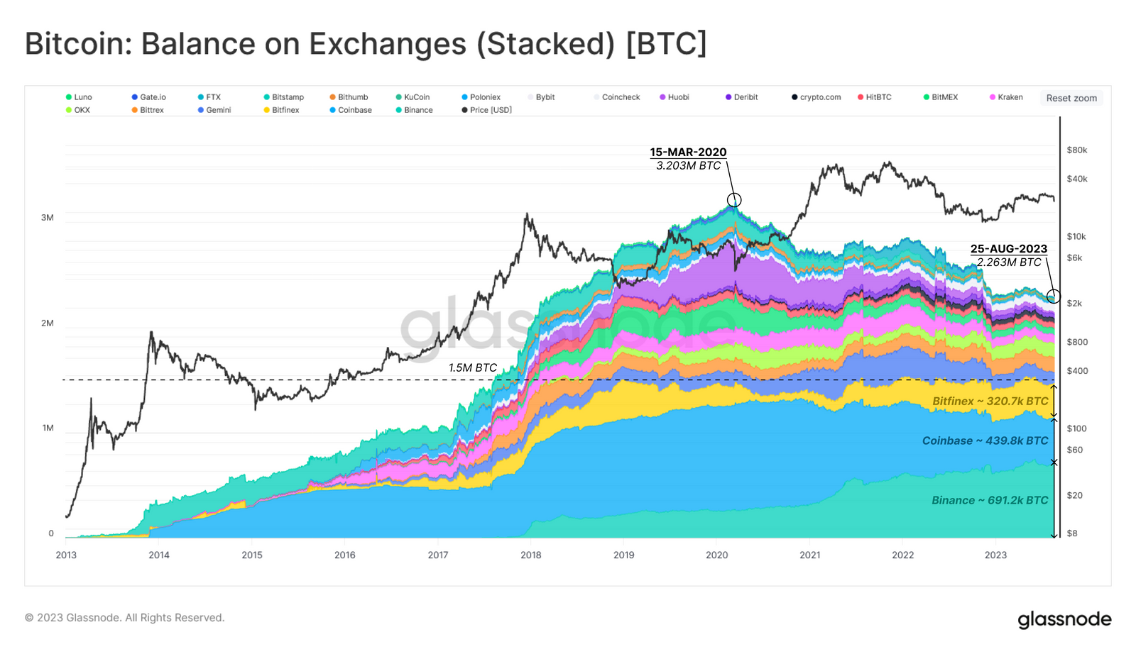 Dữ liệu từ Glassnode cho thấy, tổng số dự trữ của BTC trên sàn hiện đang khoảng 2.263 triệu BTC. Đây là mức thấp nhất kể từ 2018 đến nay.