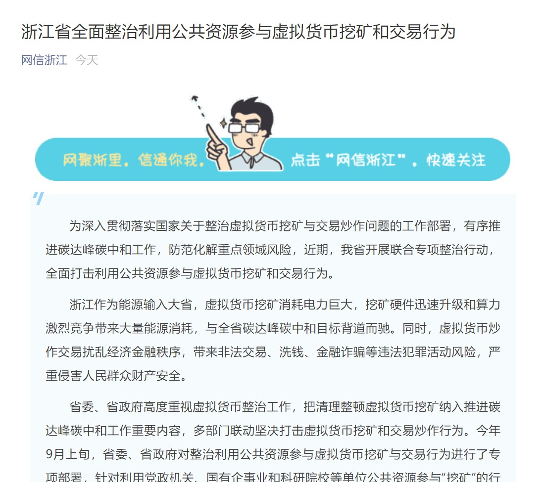 Sau lệnh kiểm soát và điều tra các đơn vị khai thác tiền điện tử trái phép. Mới đây, tỉnh Chiết Giang công bố điều tra 4,699 địa chỉ IP bị nghi khai thác tiền điện tử. Trong đó, 184 địa chỉ IP bị nghi ngờ sử dụng tài nguyên công khai để khai thác trái phép. Kết quả là nhóm thợ đào tiền điện tử bị tịch thu tài sản và buộc tham gia điều tra.