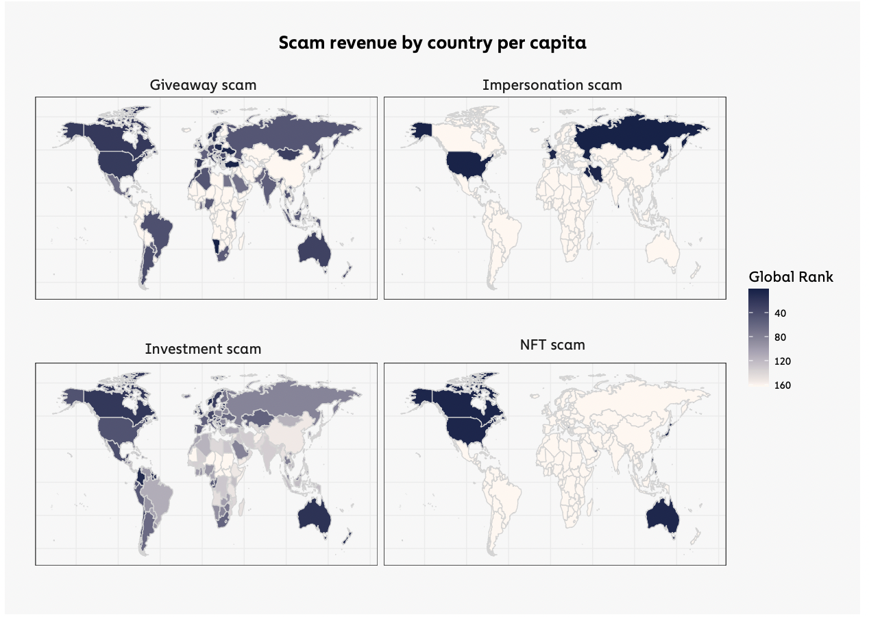 Người dân Úc là nạn nhân lớn nhất của tội phạm tiền điện tử. Một báo cáo về tội phạm tiền điện tử của Chainalysis cho thấy người dân Úc là một trong những đối tượng bị ảnh hưởng nặng nề nhất bởi các vụ lừa đảo từ các chương trình giveaway, đầu tư và non-fungible token (NFT).