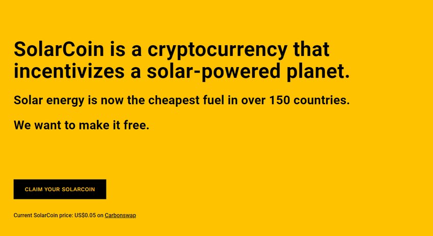 SolarCoin là một loại tiền điện tử phi tập trung nhằm mục đích huy động các hoạt động môi trường trong thế giới thực. Tiền điện tử được ra mắt vào năm 201. Mỗi megawatt-giờ một mã thông báo được tạo ra bằng công nghệ năng lượng mặt trời.