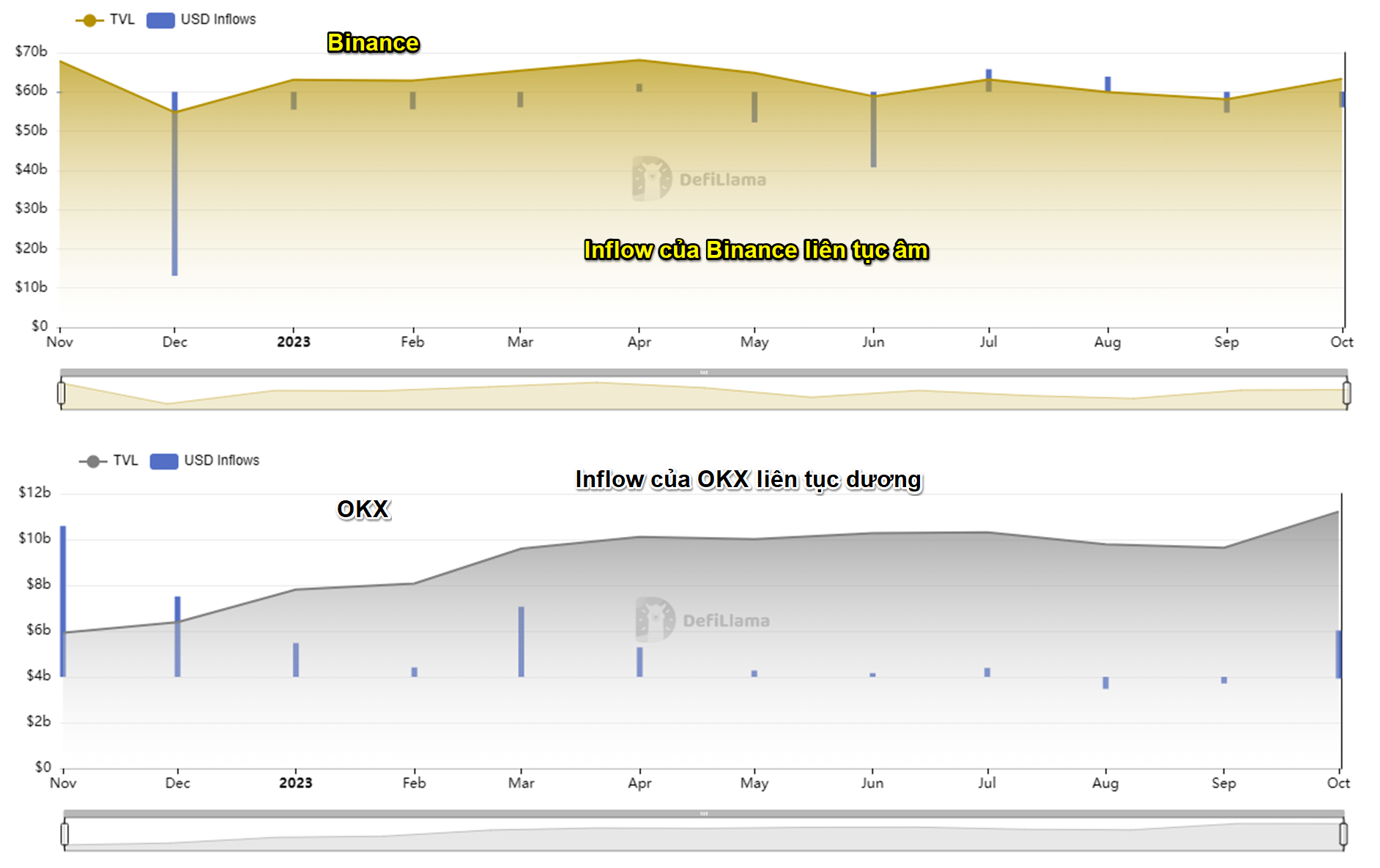 Và trong khi USD Inflow của Binance liên tục âm trong một năm qua, thì USD Inflow của OKX liên tục dương. Như vậy, hiện tượng tiền ra khỏi Binance và tiền vào OKX không phải mới xảy ra gần đây, là đã xảy ra suốt thời gian qua.