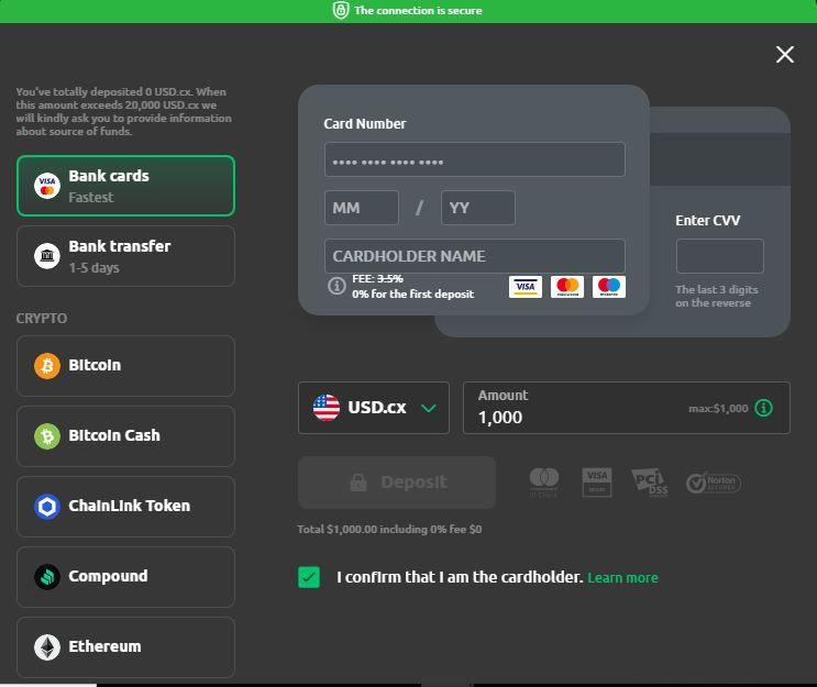 Đối với tiền gửi fiat, Currency.com khuyên bạn nên sử dụng thẻ ghi nợ hoặc thẻ tín dụng Visa/MasterCard. Vì đây là phương pháp nhanh nhất. Chuyển khoản ngân hàng cũng là một tùy chọn nhưng bạn có thể phải đợi 1-5 ngày để khoản tiền gửi hiển thị trên số dư ví của bạn.