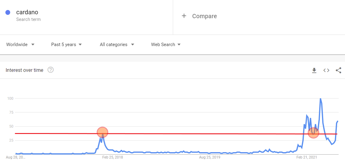 Ví dụ tốt nhất là cụm từ “Cardano”. Lượt tìm kiếm từ khoá này đã đạt giá trị 38 (đường màu đỏ). Ở mức cao nhất năm 2017-2018. Vào thời điểm đó, ADA mới ra mắt được vài tháng. Và nó nhanh chóng ghi nhận mức giá cao nhất lịch sử với gần $1.30. Vào giữa tháng 5 năm nay, ngay trước khi thị trường tiền điện tử sụp đổ, sự quan tâm đến dự án Cardano đã đạt đỉnh 100. Và ADA sau đó cũng tăng lên ATH mới tại $2.47.