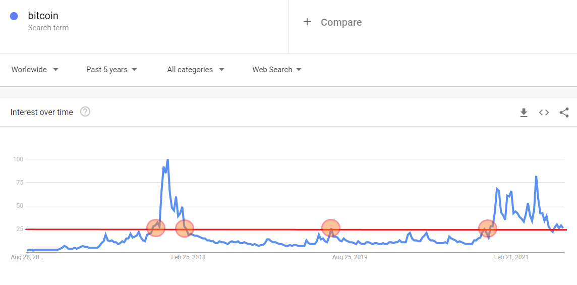 Trên thực tế, nếu bạn nhìn vào biểu đồ tìm kiếm dài hạn cho cụm từ “Bitcoin” trong 5 năm qua, bạn sẽ có ấn tượng rằng mối quan tâm lớn đến từ khoá này đang giảm dần. Hiện tại, số lượng tìm kiếm trung bình hàng tuần của Bitcoin chỉ đạt khoảng mức 25 (đường màu đỏ) trên biểu đồ do Google Xu hướng cung cấp. Trong thang đo này, giá trị lớn nhất là 100. Đây cũng là mức mà Bitcoin đạt được hồi cuối thị trường tăng giá trước đó, vào tháng 12 năm 2017.