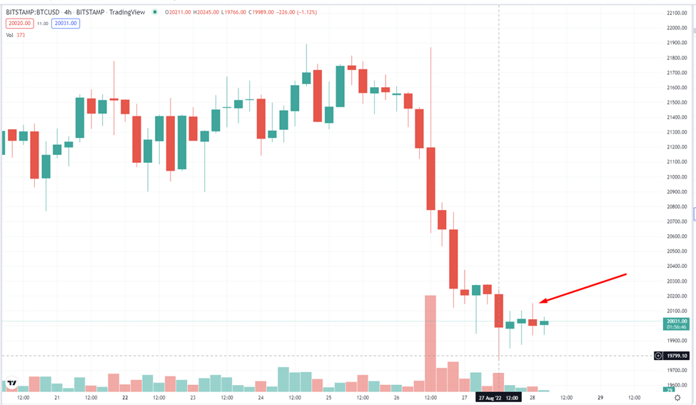 Tối ngày 27/8, giá Bitcoin đã sụt giảm tạo bóng nến chạm đáy 19,800 USD trước khi đóng nến. Quan sát biểu đồ khung thời gian 4 giờ xuất hiện bốn nến hình sao thể hiện sức đối kháng giữa phe bò và gấu. giá Bitcoin Cash cũng ảnh hưởng từ tin tức, giảm nhẹ xuống mức 115.5 USD tại thời điểm viết bài. Đến trưa ngày 28/8, Bitcoin trở lại mức 20,000 USD.