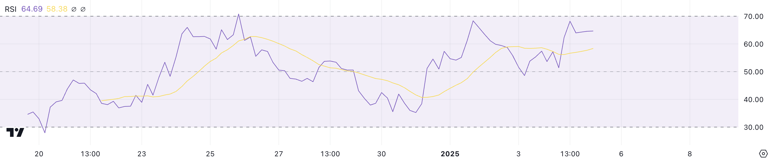 Chỉ số Sức mạnh Tương đối (RSI) của PENGU hiện tại là 64.6, phản ánh động lực mạnh mẽ nhưng vẫn dưới ngưỡng quá mua là 70. RSI đo lường tốc độ và sức mạnh của sự thay đổi giá trên thang điểm từ 0 đến 100, với các giá trị trên 70 cho thấy điều kiện quá mua và khả năng điều chỉnh. Ngược lại, các giá trị dưới 30 cho thấy điều kiện quá bán và khả năng phục hồi.