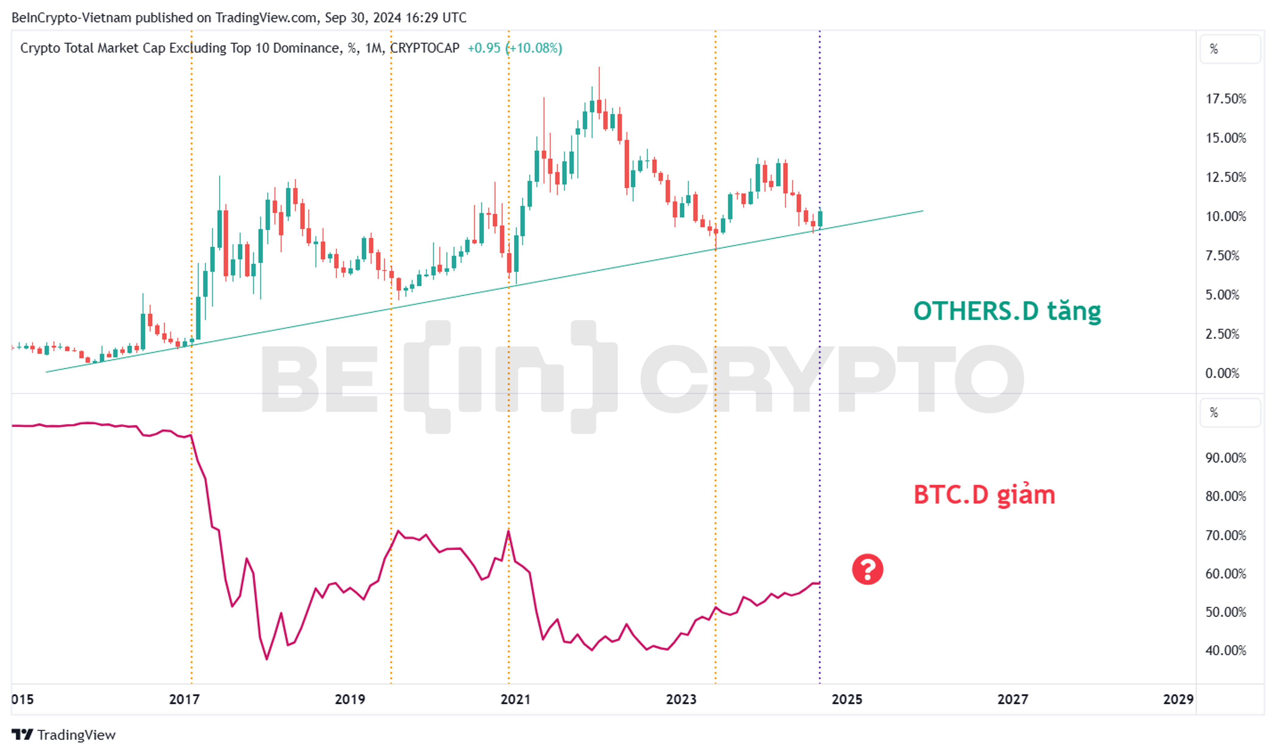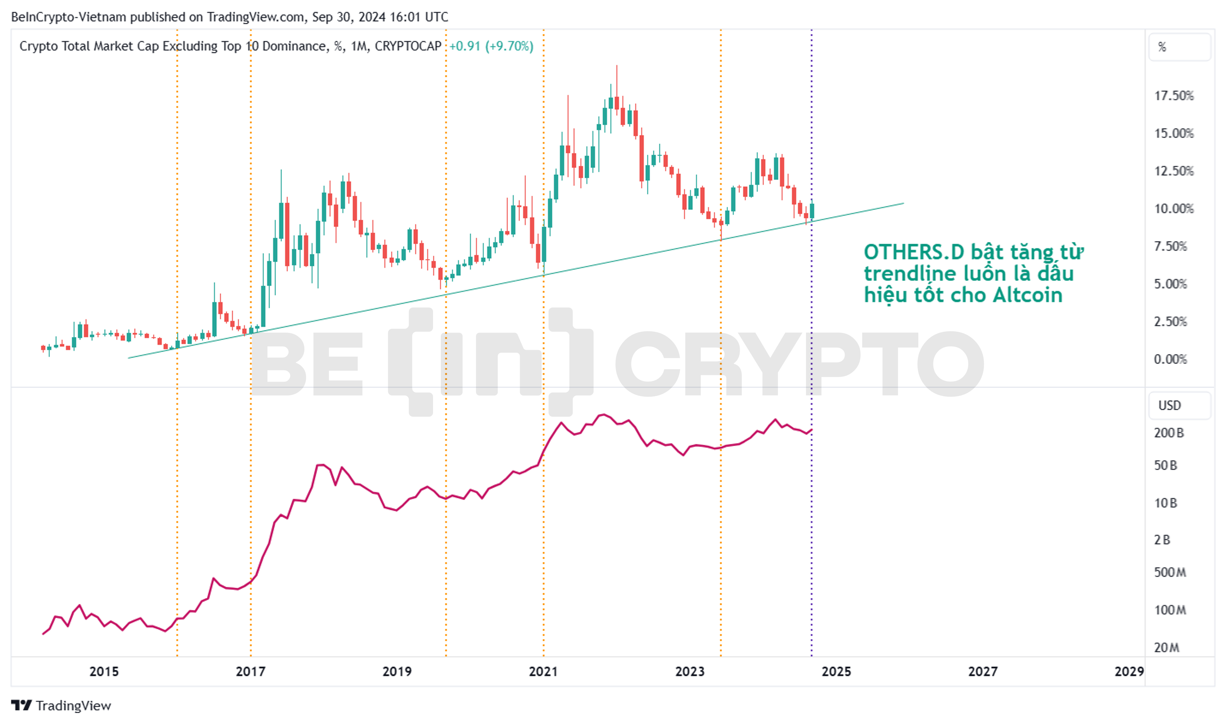 Trong những lần OTHERS.D khung tháng bật tăng từ trendline, đều là khởi đầu cho một đà giảm mạnh của BTC.D. Do đó, việc OTHERS.D tăng trong tháng 09 như minh họa trên là niềm hy vọng mới để kỳ vọng BTC.D sẽ giảm và Altcoin season có thể trở lại. Nếu nhà đầu tư tin cậy tín hiệu này, thì đây cũng là thời điểm mua Altcoin tốt hơn rất nhiều so với hồi quý đầu năm.