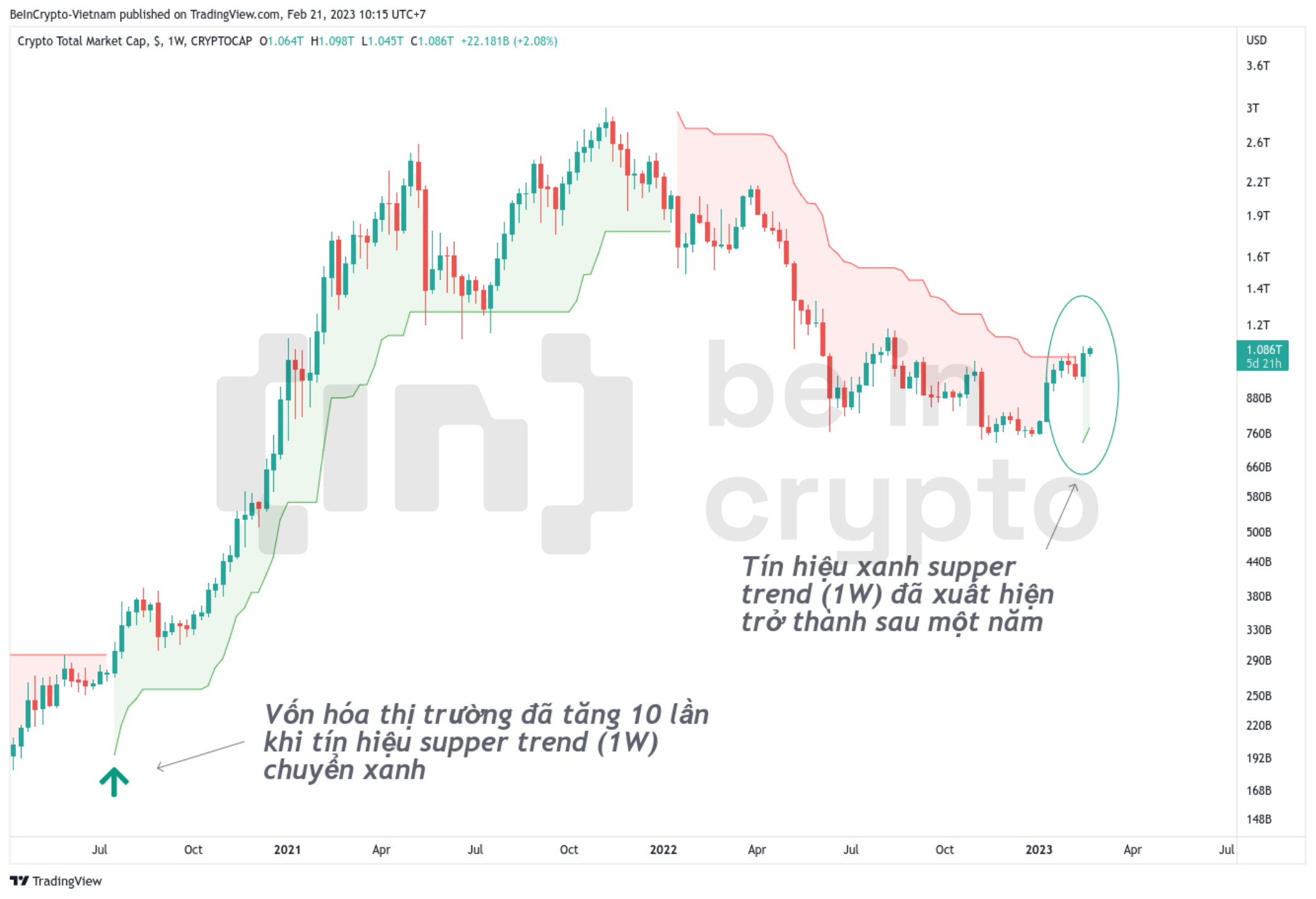 Tín hiệu Supper Trend là một chỉ báo kỹ thuật được phát triển bởi Olivier Seban. Chỉ báo này được sử dụng để dự đoán một “trend” như tên gọi của nó. Áp dụng trong khung thời gian càng lớn thì sự xác nhận của trend càng lâu. Ở đây, chúng ta quan sát Supper Trend với biểu đồ vốn hóa thị trường trong khung tuần (1W).