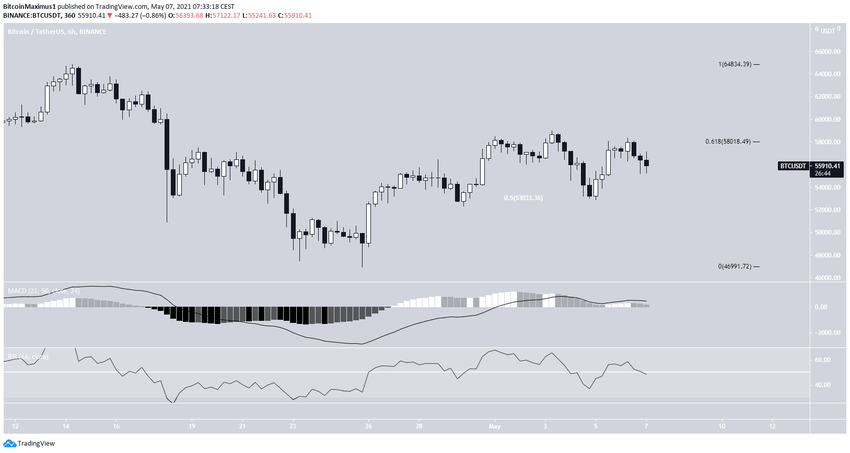 Kể từ sau khi bật lên tại vùng hỗ trợ 53,000 USD vào ngày 5 tháng 5, BTC đã tăng lên đáng kể. Vùng hỗ trợ được tạo ra bởi mức Fibo thoái lui 0.5 của chuyển động tăng trưởng gần đây (màu trắng).