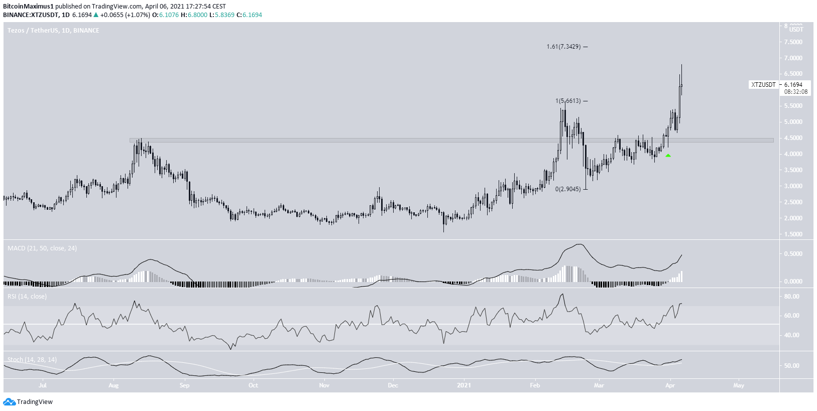 Vào ngày 31/03, XTZ sau nhiều lần bị từ chối tại mức kháng cự 4.5 USD. Nó đã đột phát thành công và hoạt động trên mức này. Theo quan sát biểu đồ khung thời gian hằng ngày, một sự hỗ trợ mạnh đã đẩy XTZ trên mức kháng cự. Vào ngày 6 tháng 4, nó đã đạt mức tạo đỉnh mới là 6.80 USD.